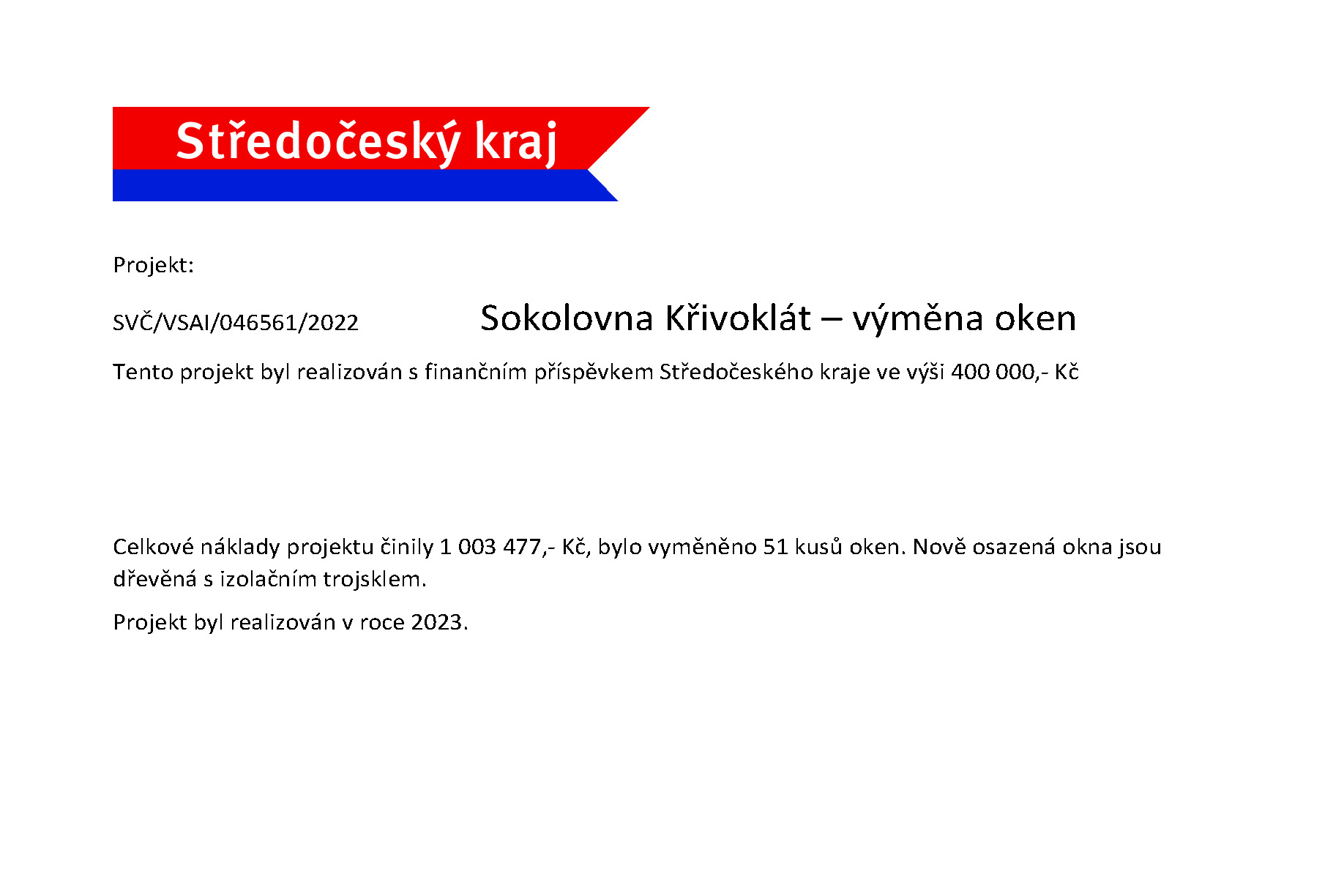 Cílem projektu je komplexní obnova sokolovny Sokol Křivoklát, aby mohla i v dalších desetiletích plnohodnotně sloužit především sportovním, kulturním a komunitním aktivitám městyse Křivoklát a okolních obcí sdružených v mikroregionu Křivoklátsko.